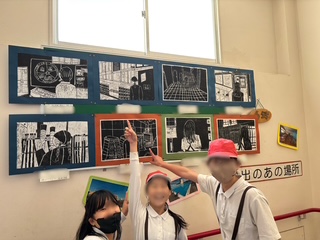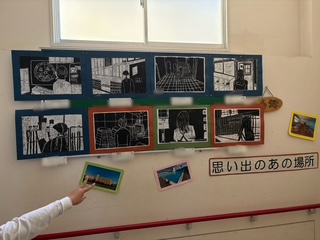 6年生は「思い出のあの場所」というテーマで版画を作りました。6年生が喜びいっぱいで掲示板の前に立っています。
