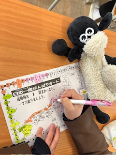 走った周をもとにがんばりカードに色を塗っていきます。このカードは日本一周タイプですね。