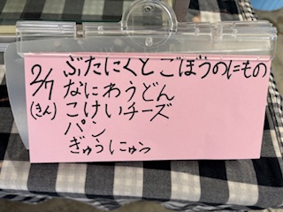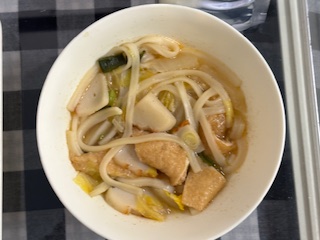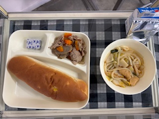 今日の給食は、なにわうどんです。きつねうどんのイメージです。大阪の味です。