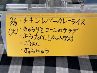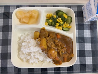 今日の給食は、チキンレバーカレーライス、きゅうりとコーンのサラダです