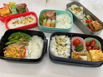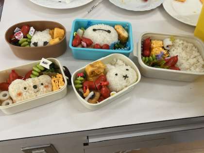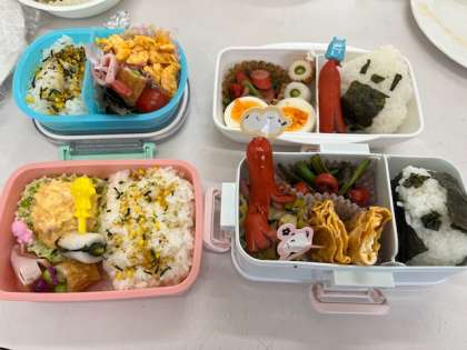 お弁当が完成しました。のりやふりかけを使って、盛り付けも工夫しています。