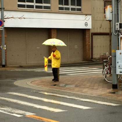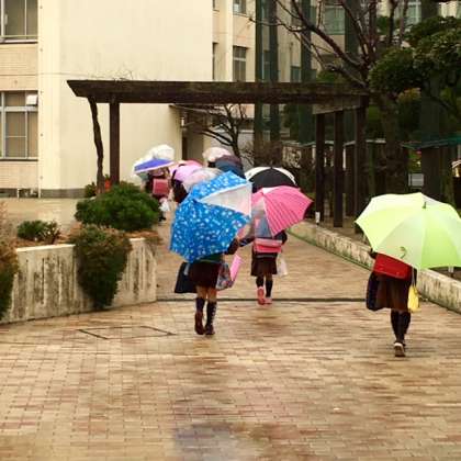 子どもたちの登校も、傘の花が咲いています。地域やPTAの皆さんに見守られながら、子どもたちが登校しています。