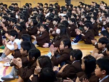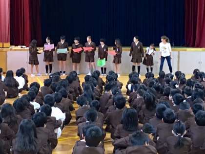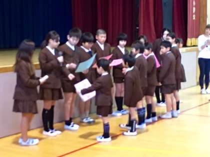 今朝は児童朝会が講堂で行われました。運営委員会からは今週土曜日の「なかよし集会」について話しがありました。給食委員会からは、先週の「給食マナー週間」の表彰がありました。