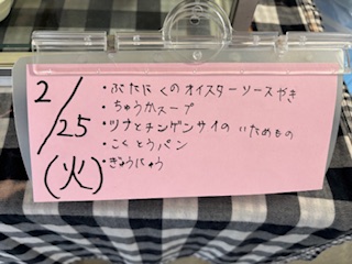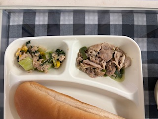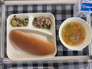 今日の給食は、中華スープでした。パンは黒糖パンでした。