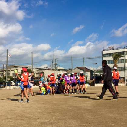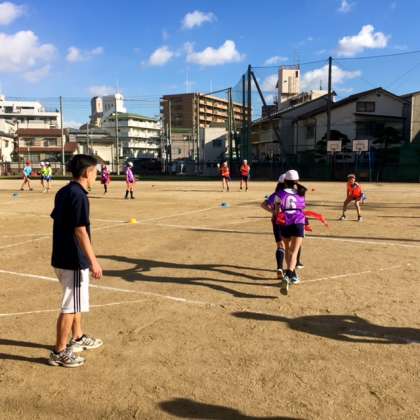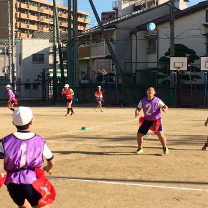 6年2組の体育の授業です。今日も石倉先生によるFLAG-FOOTBALLの授業です。
