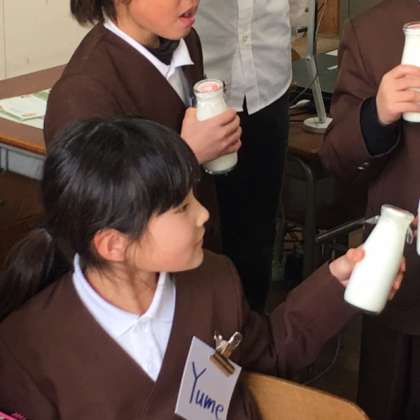 今日は、児童の誕生日でしたので、みんなで「ハッピーバースデートゥユー」を歌い、牛乳で乾杯していました。