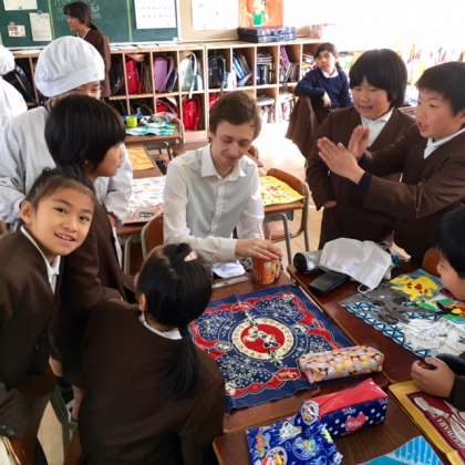 イングリッシュ・ウィーク3日目、今日はマット先生ミリーン先生は4年1組の児童と昼食をとります。準備ができるまでの間、子どもたちと楽しいお話や、児童がリコーダーを演奏して交流しています。