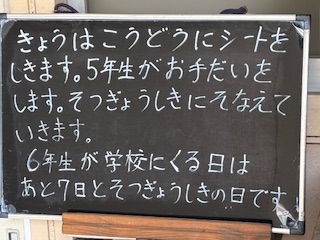 今日は講堂にシートを敷きます。5年生がお手伝いします。卒業式の準備が整ってきています。