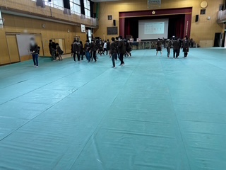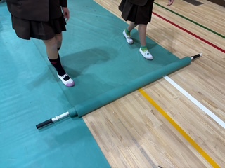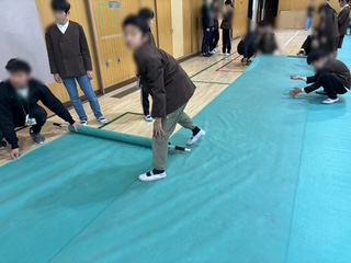 卒業式に向けて、講堂のシート敷きをしました。5年生がていねいに作業しています。