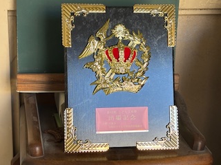 児童朝会で、こども文化祭への出場記念の盾を、出場したエイサーの代表の6年生に渡しました
