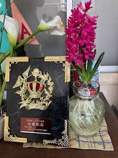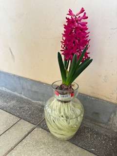 校長室前に置いている水栽培のヒヤシンスが咲きました。春の香りも運んできています。