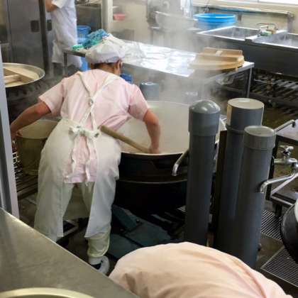 給食調理員さんは、温かく美味しい給食を提供するのに、いつも時間とのたたかいです。ありがとうございます。