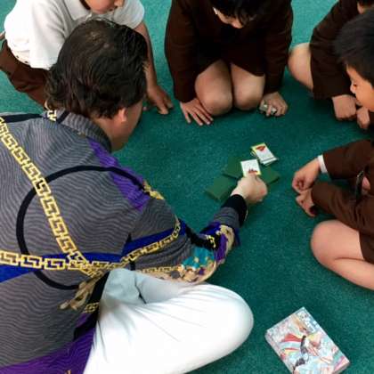 6時間目はクラブの時間ですが、室内ゲームクラブの子どもたちは、イングリッシュ・ウィークの講師の先生方を誘って「かるた遊び」をしています。