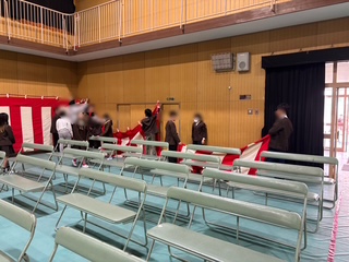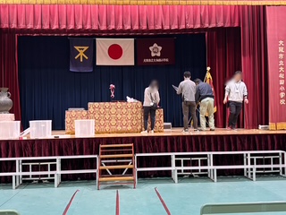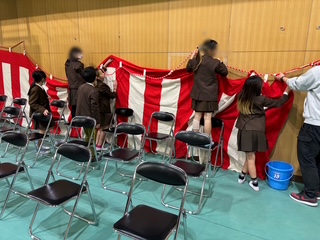 紅白幕が張られて、舞台の飾りつけもすすめています