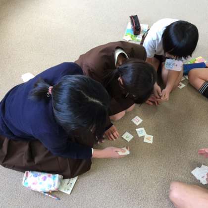 外国語活動5年2組の様子です。5年生と6年生は毎週金曜日にオコリー先生に外国語活動で英語を学んでいます。今日はアルファベットを聞き取るカルタのアクティビティを受けています。とても楽しそうです。