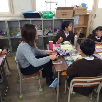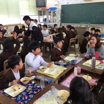 イングリッシュ・ウィーク5日目、講師の先生方は、今日も給食の時間子どもたちと一緒です。4年1組はとても和やかな雰囲気です。子どもたちも講師の先生方もとても積極的に会話しています。マット先生はパンを、ミリーン先生はお弁当を作って来られました。