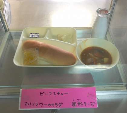 今日の献立は、ビーフシチュー、カリフラワーのサラダ、固形チーズ、大型コッペパン、牛乳です。