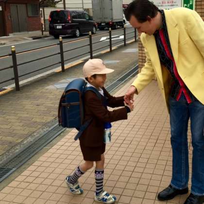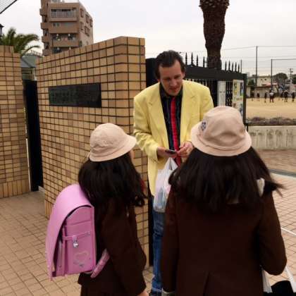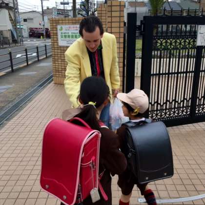今日は、土曜授業・なかよしフェスティバルです。イングリッシュ・ウィークも6日目を迎えました。正門では、マット先生が子どもたちに英語であいさつしています。