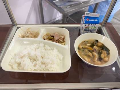 みそ汁は、豚肉、うすあげ、玉ねぎ、にんじん、キャベツ、わかめが入った具だくさんのみそ汁です。