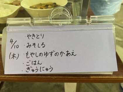 やきとり、みそ汁、もやしのゆずの香あえ、ご飯、牛乳です。