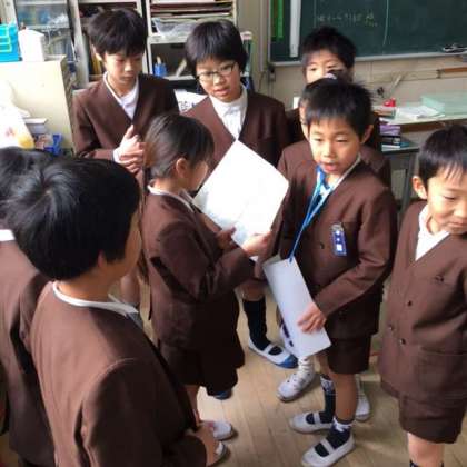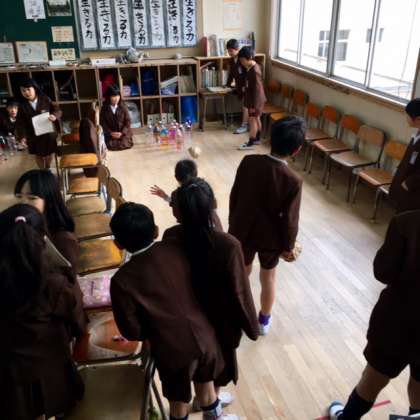 3年2組のお店は「ボーリング」です。みんなで力を合わせてピンを倒します。