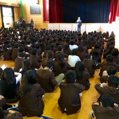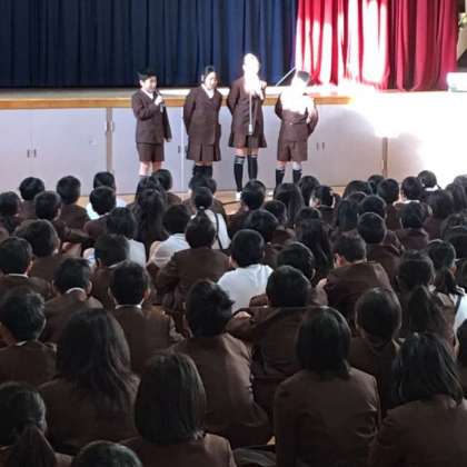 気温が低いため、今朝の児童朝会は講堂で行いました。