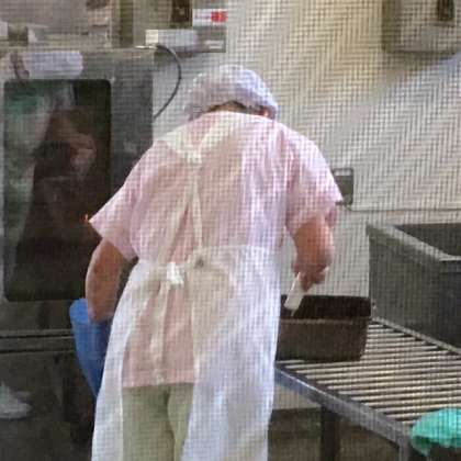 寒い日の楽しみは、温かい給食ですね。給食室の寒暖計は摂氏6度を指していました。その中で、給食時間に合わせて給食の最終仕上げです。