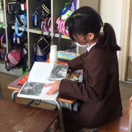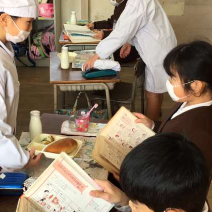 4年1組に来ています。給食係さんが配膳してくれる間、他の児童は本を読んで静かに待っています。