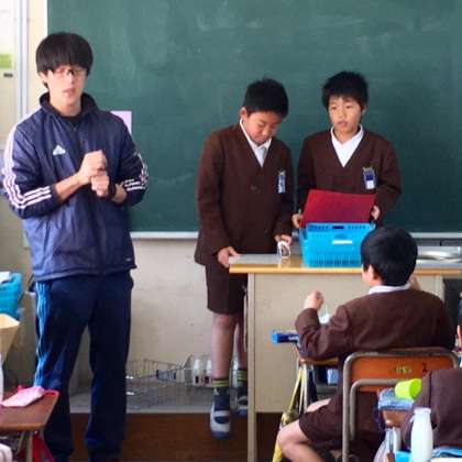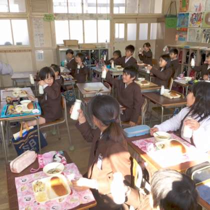 4年1組、給食のはじまりです。給食の最初に、今日誕生日を迎えた児童を、みんなでお祝いします。牛乳で乾杯して「おめでとう」と声がかかります。とても和やかなクラスです。その後、当番さんが給食マナー週間の注意をしていました。