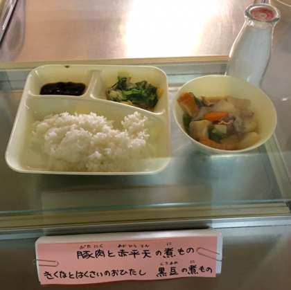 今日の献立は、豚肉と赤平天の煮物、菊菜と白菜のおひたし、黒豆の煮物、ごはん、牛乳です。
