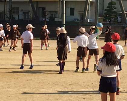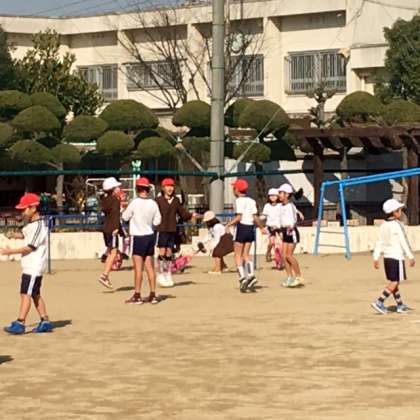 太陽が運動場を照らして、暖かくなりました。子どもたちは思い思いに運動しています。