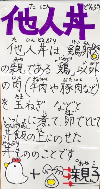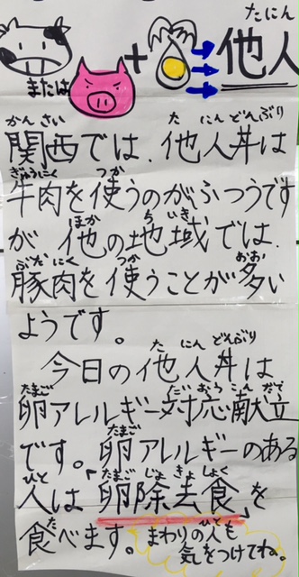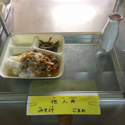 今日の献立は、他人丼、味噌汁、ごまめ、牛乳です。