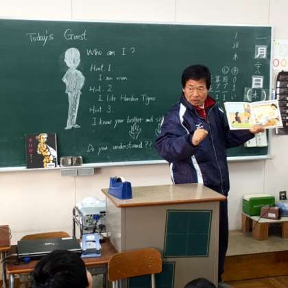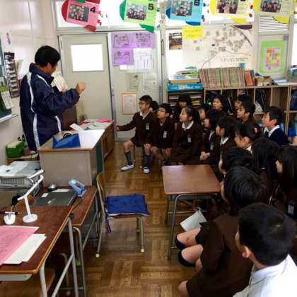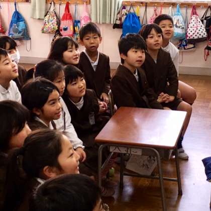 木曜日の朝は「読書タイム」です。今朝は、2年1組の教室に、6年生担任の大西先生が絵本の読み聞かせに来てくれました。