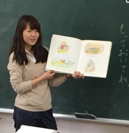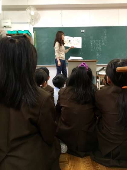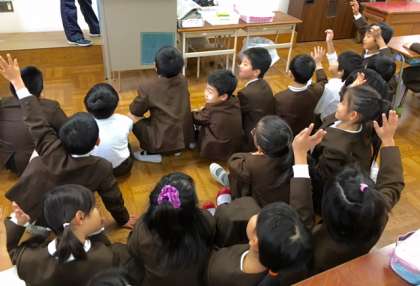 2年2組の読書タイムの様子です。担任の福間先生が絵本の読み聞かせをしています。子どもたちは読書タイムが大好きです。絵本を読みながら、子どもたちが絵本の世界に引き込まれ、先生の質問に答えています。