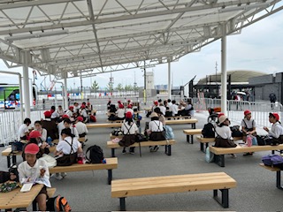 とてもいい天気です。万博会場にはたくさんの人が訪れています。入場に少し時間がかかりましたが、休憩所でお弁当とおやつを楽しんでいます。