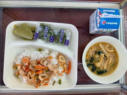 ごはんやうどんに混ぜる具のことを「かやく」といいます。今日のかやくごはんには、鶏肉、ちくわ、にんじん、さんどまめが入っています。