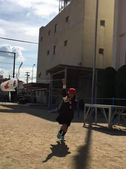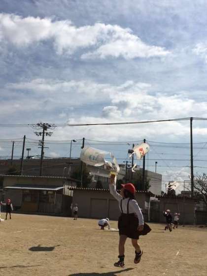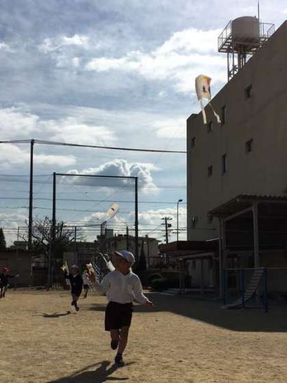4時間目1年2組の児童は、生活の時間に作製した凧を揚げていました。暖かい日差しを受けて、児童は夢中で凧を揚げています。