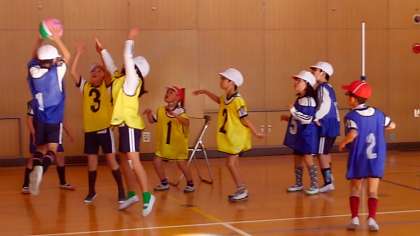 2年生は、ボール遊びで的あてゲームをしていました。ボールを投げる、受けるということを中心に、チーム内で作戦を立てて、楽しく活動していました。学び合いが学習を重ねていくことを通して年度当初より深まってきています。
