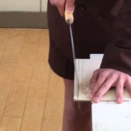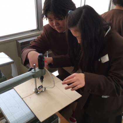 図工の授業です。6年1組が工作室で切ったり、削ったり、打ちつけたりしながら作品を作っています。みんな真剣です。