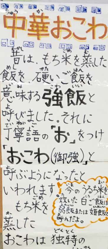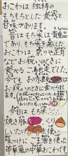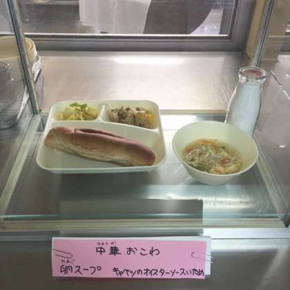 今日の献立は、中華おこわ、キャベツのオイスターソース炒め、卵スープ、黒糖パン、牛乳です。