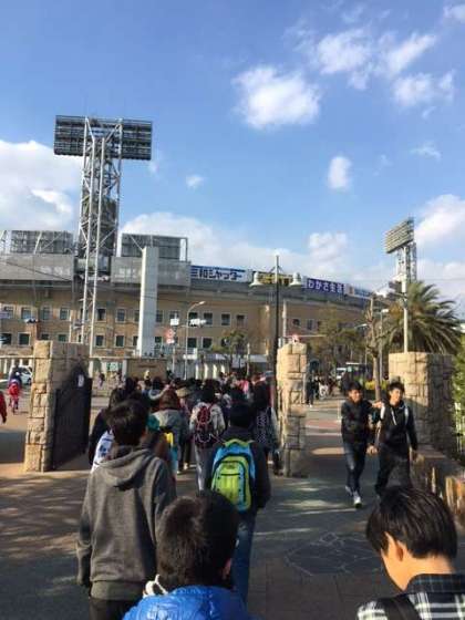 甲子園駅から阪神電車に乗りました。学校には16時頃到着予定です。