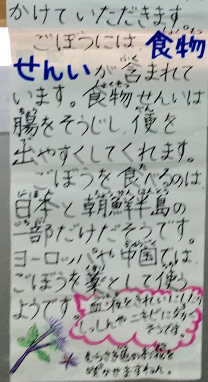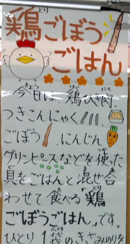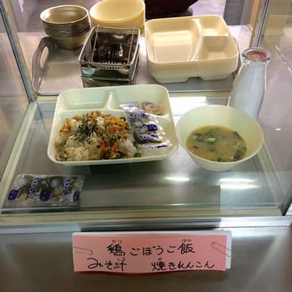 今日の献立は、鶏ゴボウごはん、焼きレンコン、味噌汁、牛乳です。