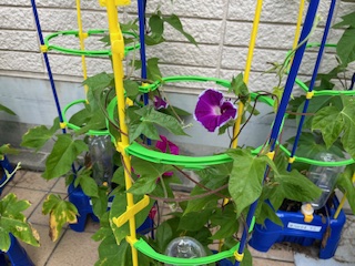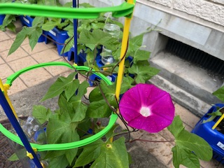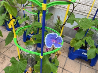 梅雨空の下で、アサガオの花が咲き始めています。1年生のみんなが、毎朝、水やりと観察を続けています。水やりの時に、「大きくな〜れ」と声をかけている子もいました。