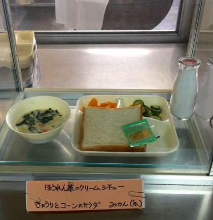 今日の献立は、ほうれん草のクリームシチュー、キュウリとコーンのサラダ、ミカンの缶詰、食パン、牛乳です。
