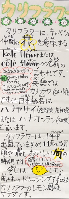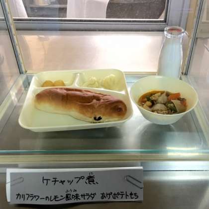 今日の献立は、ケチャップ煮、揚げポテト餅、カリフラワーのレモン風味サラダ、レーズンパン、牛乳です。
