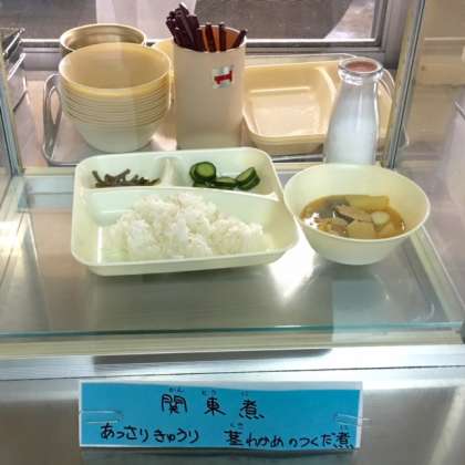 今日の献立は、関東煮、あっさりキュウリ、茎わかめの佃煮、ごはん、牛乳です。