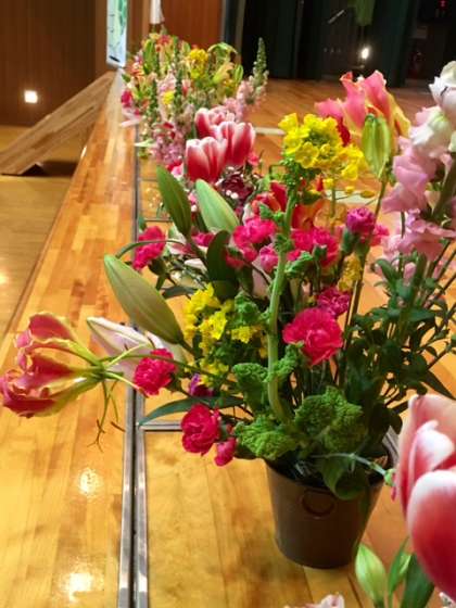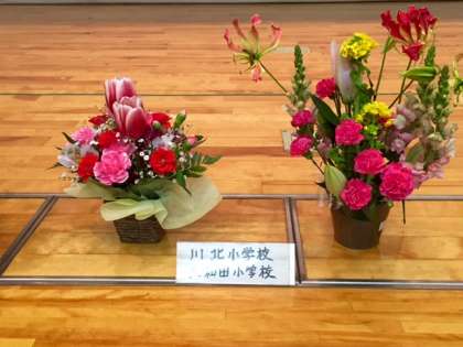 舞台を飾る花々は、川北小学校・大和田小学校生涯学習ルームの作品でした。ありがとうございます。