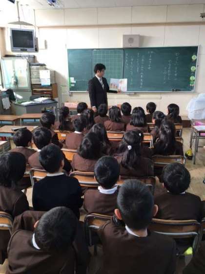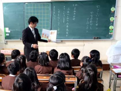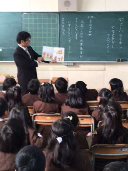 今朝は1年1組に3年生担任の山本先生が読み聞かせに来てくださいました。
