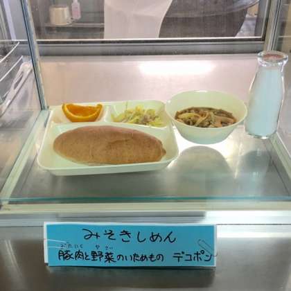 今日の献立は、味噌きしめん、豚肉と野菜の炒め物、ライ麦パン、清見オレンジ、牛乳です。