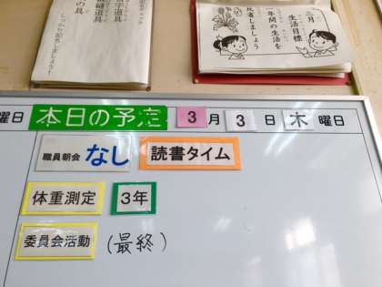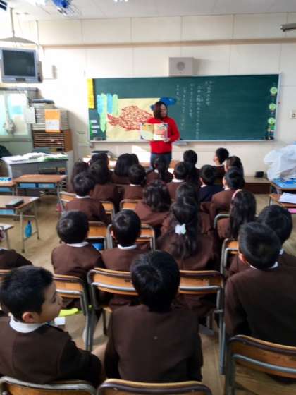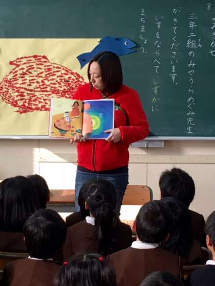 1年1組は、3年生宮浦先生の読み聞かせです。